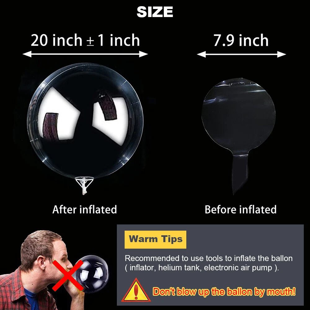 These luminous LED balloons are made of quality latex material, which are non-toxic, transparent, not easy to break and reusable. The size of the balloons is 7.9 inches. Due to their good materials and thickness, they can be expanded to 20 inches. -
