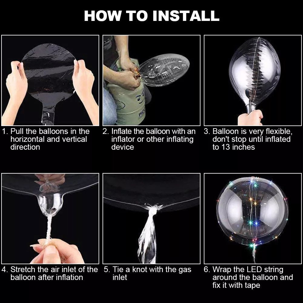 You can refer to the pictures, using the inflation tool to fill these luminous balloons with air or helium, and then put the batteries into the battery box (not including the battery), helping you quickly decorate your desired party and bringing you the unforgettable experience. -