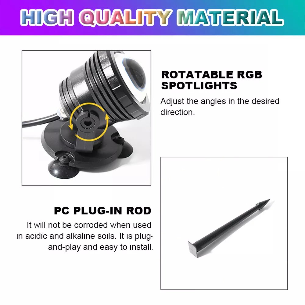 • 2/4PCS Outdoor Spot Lights: 12W RGB spotlights have high-power LED chips and ensure high brightness light output. With a full spectrum of colors, can easily customize lighting colors to match your yard or house. Brightness, speed and style can flexibly adjust to cater to different atmospheres and occasions.