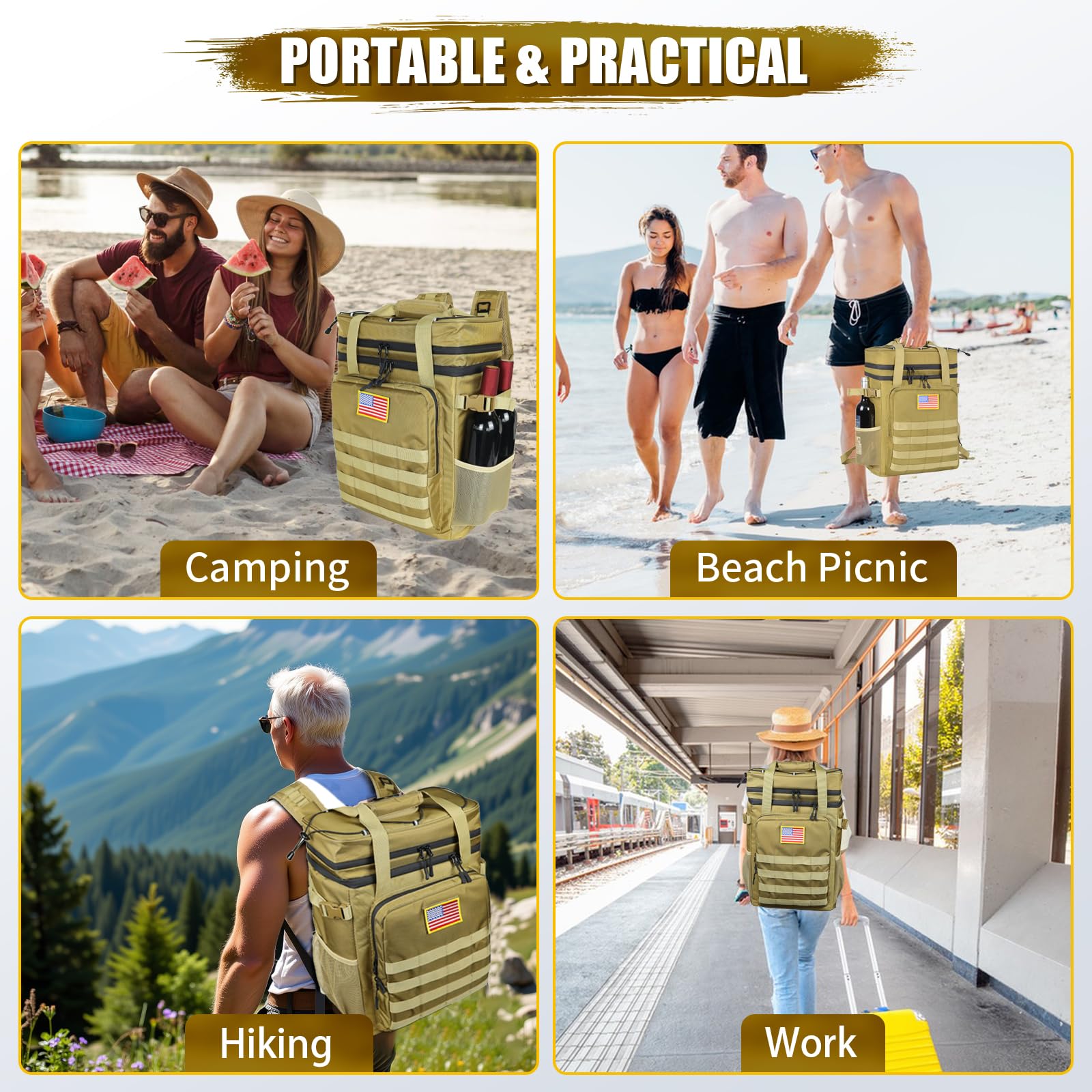 - Functional Design: The molle webbing on the front can customize your carrying options. Straps at the top are perfect for packing a blanket and a bottle opener adding extra convenience. The soft, breathable sponge padding effectively reduces shoulder and back pressure, ensuring all-day comfort during family beach trips, camping, picnics, hiking, hunting, fishing and other outdoor pursuits.