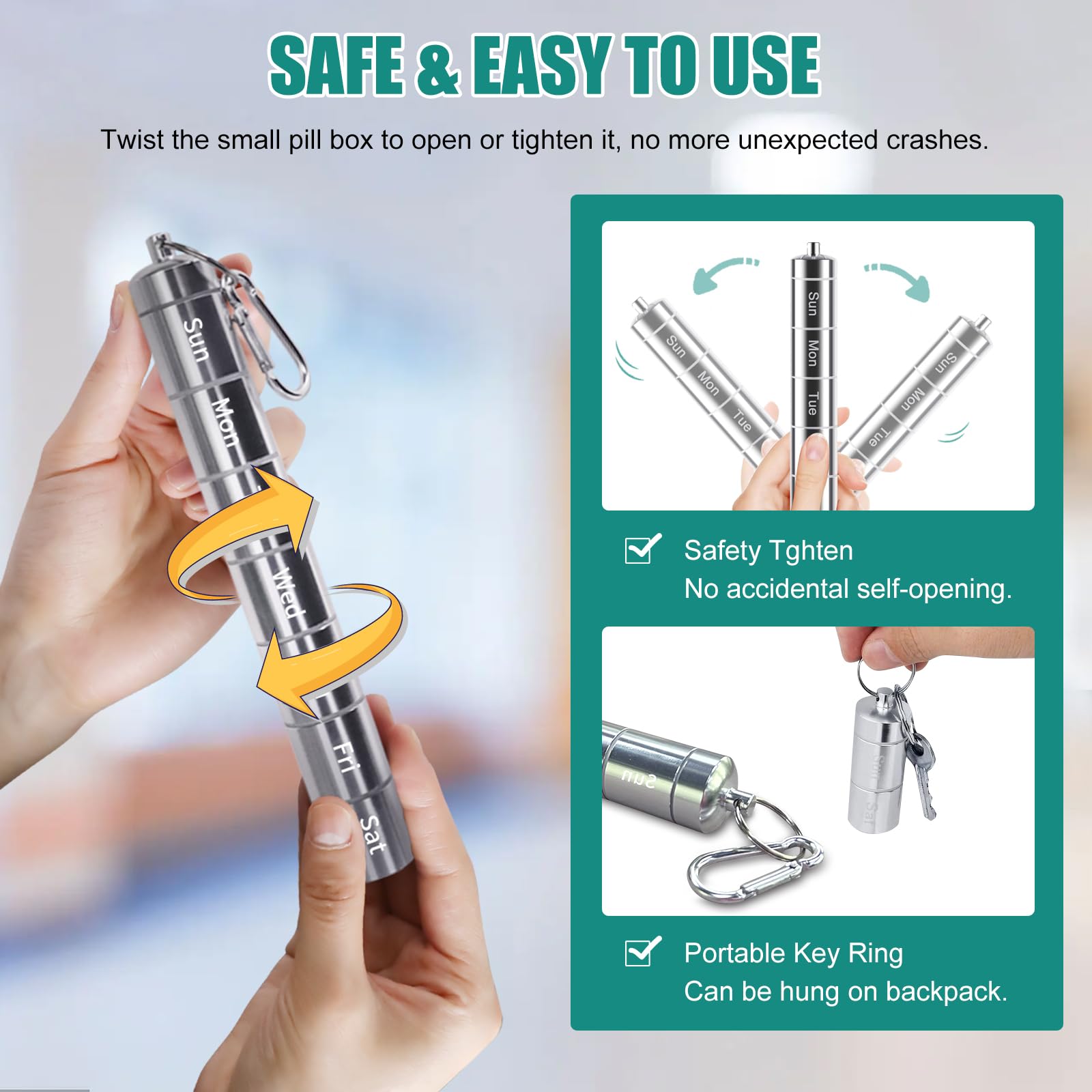 - High-Quality Metal Material: The travel pill organizer is made of high-quality metal, ensuring durability and long-lasting use, keeping your medication safe and reliable.